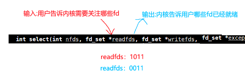 readfds还是一个输入输出参数,当用户传入时表示用户告诉内核需要关注哪些fd,当内核传出时会修改readfds,表示有哪些fd就绪。但也侧面说明了readfds数值不是固定的,是会变动。但这也就表明如果有些fd这次没有就绪,下一次如果不重新调整readfds就不会关心了。