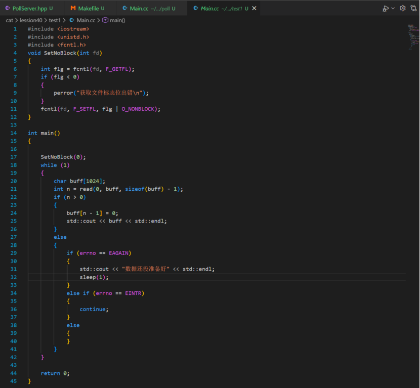 上图示例,将0号fd(标准输入/键盘输入)的flag设置为非阻塞后,可以看到在使用read系统调用后进程就不会阻塞住,而是往下接着执行。在n<0后还需接着判断全局指针erron的属性是否是 EAGAIN,是的话就表示数据还没准备好。