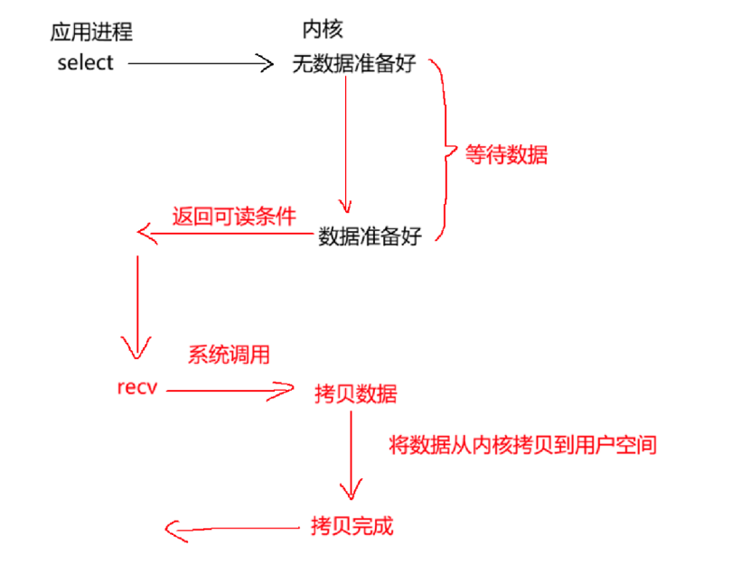 从上示意图可以很简单明了的看到,当select返回读事件就绪时,再调用recv后肯定****不会阻塞,因为此时读事件一定就绪。****如果直接使用recv而不使用select,可能就是阻塞调用,因为recv内部会等待读事件就绪。