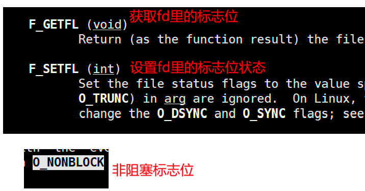 因此F_GETFL表示获取该fd里的flag标志位,F_SETFL标色设置flag标志位属性后与O_NONBLOCK结合使用。