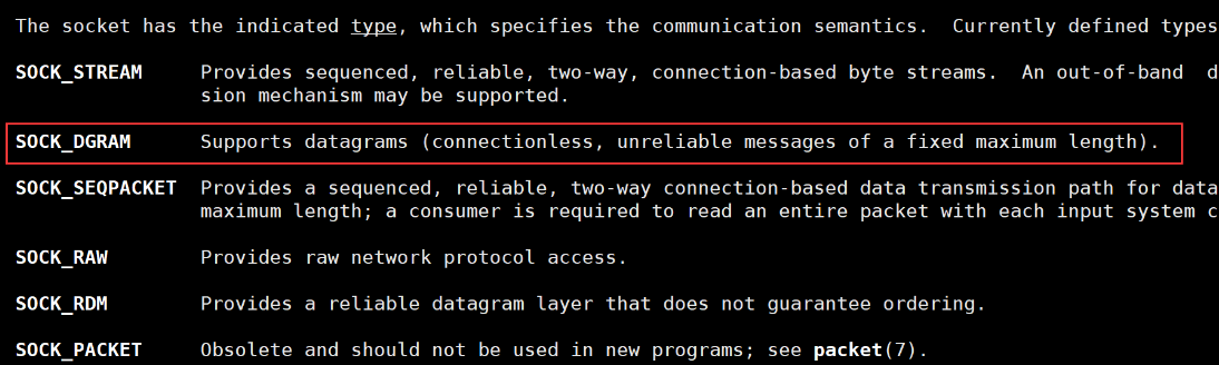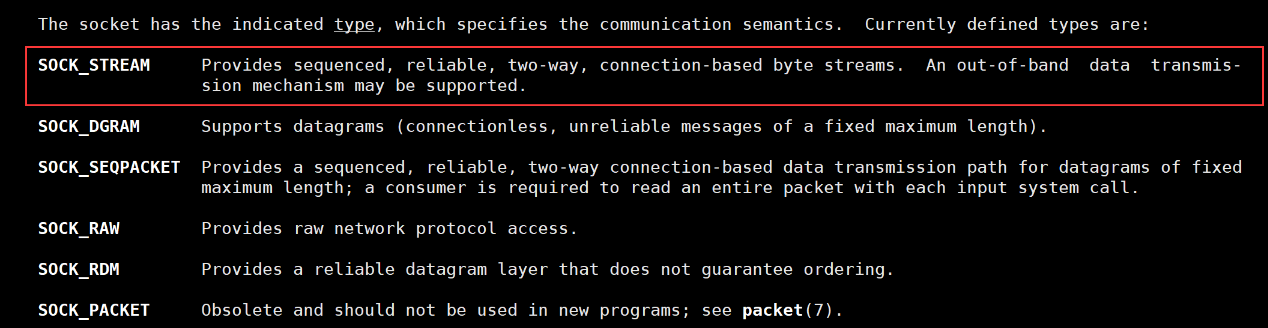- type表示的是套接字的类型,它用来标识我们通信的时候对应的报文类型,报文类型分为流式类型和用户数据报类型;