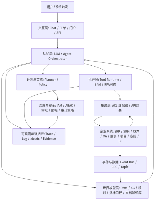 • 执行层(Tools/Workflow) :工具调用、BPM、RPA(可选)、审批与权限