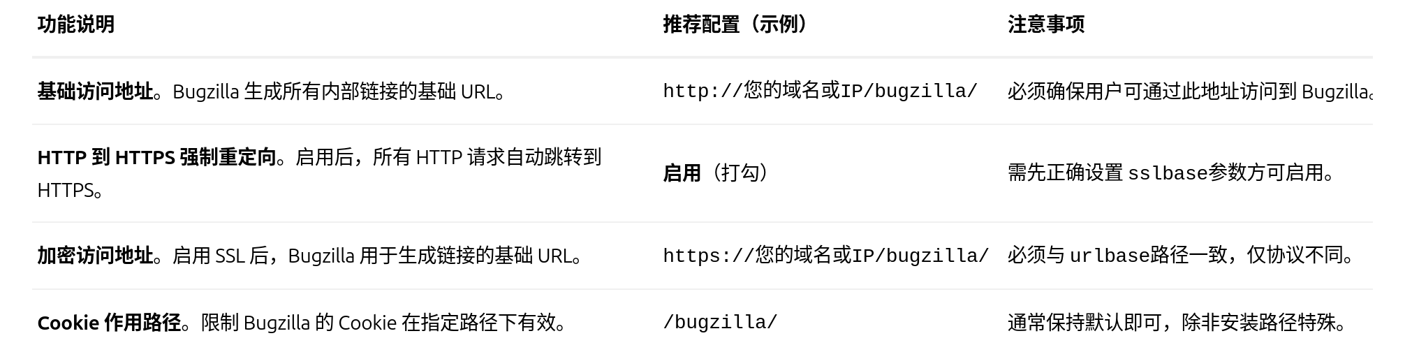 路径一致性:确保 urlbase和 sslbase的路径部分完全一致(如都包含 /bugzilla/)。