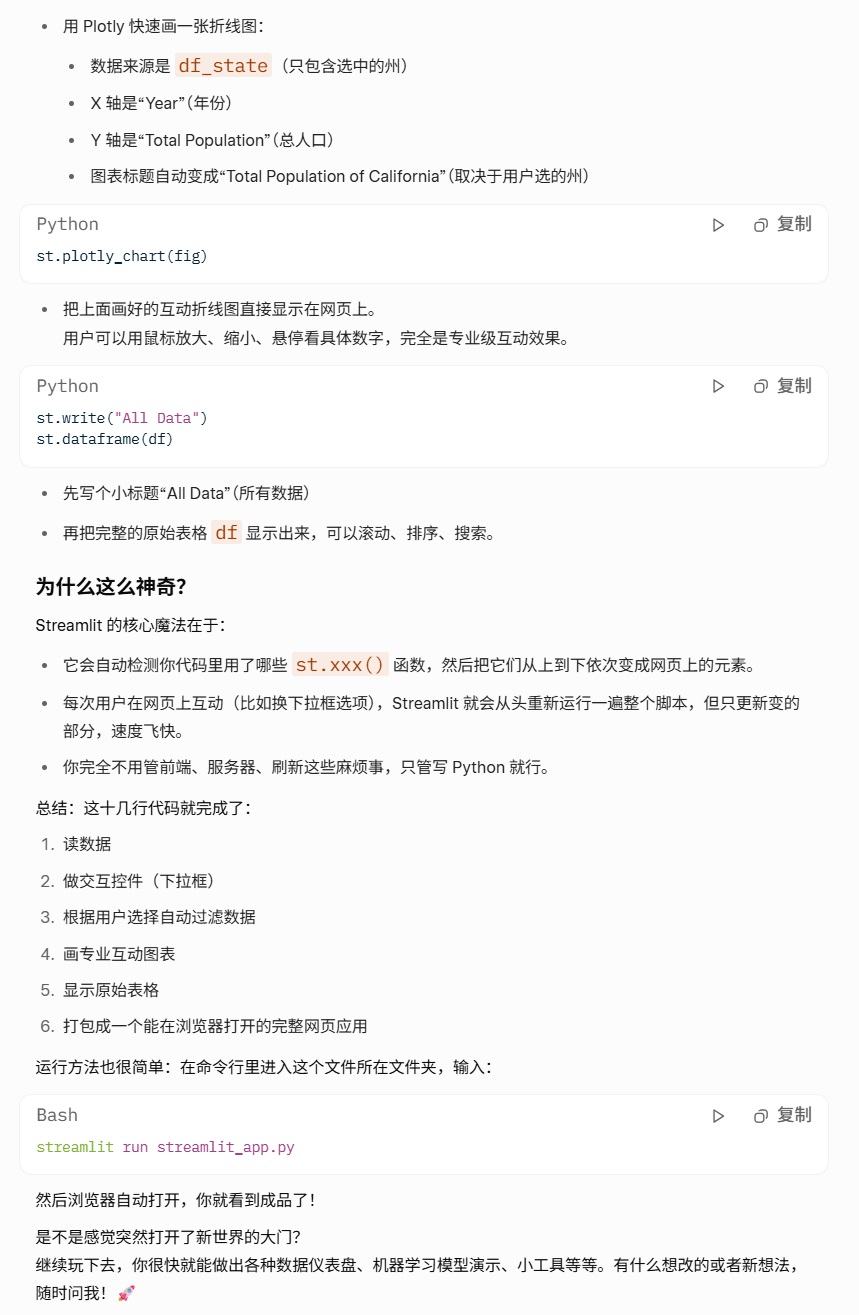 Streamlit :把前面做的表、图、模型包在一起,不用懂网页,直接生成一个可交互的网页 App,别人打开浏览器就能用。