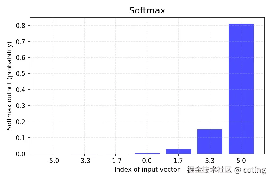 Softmax 输出的是一组归一化的概率,在图中使用 柱状图 (bar chart) 展示每个输入元素对应的概率值。