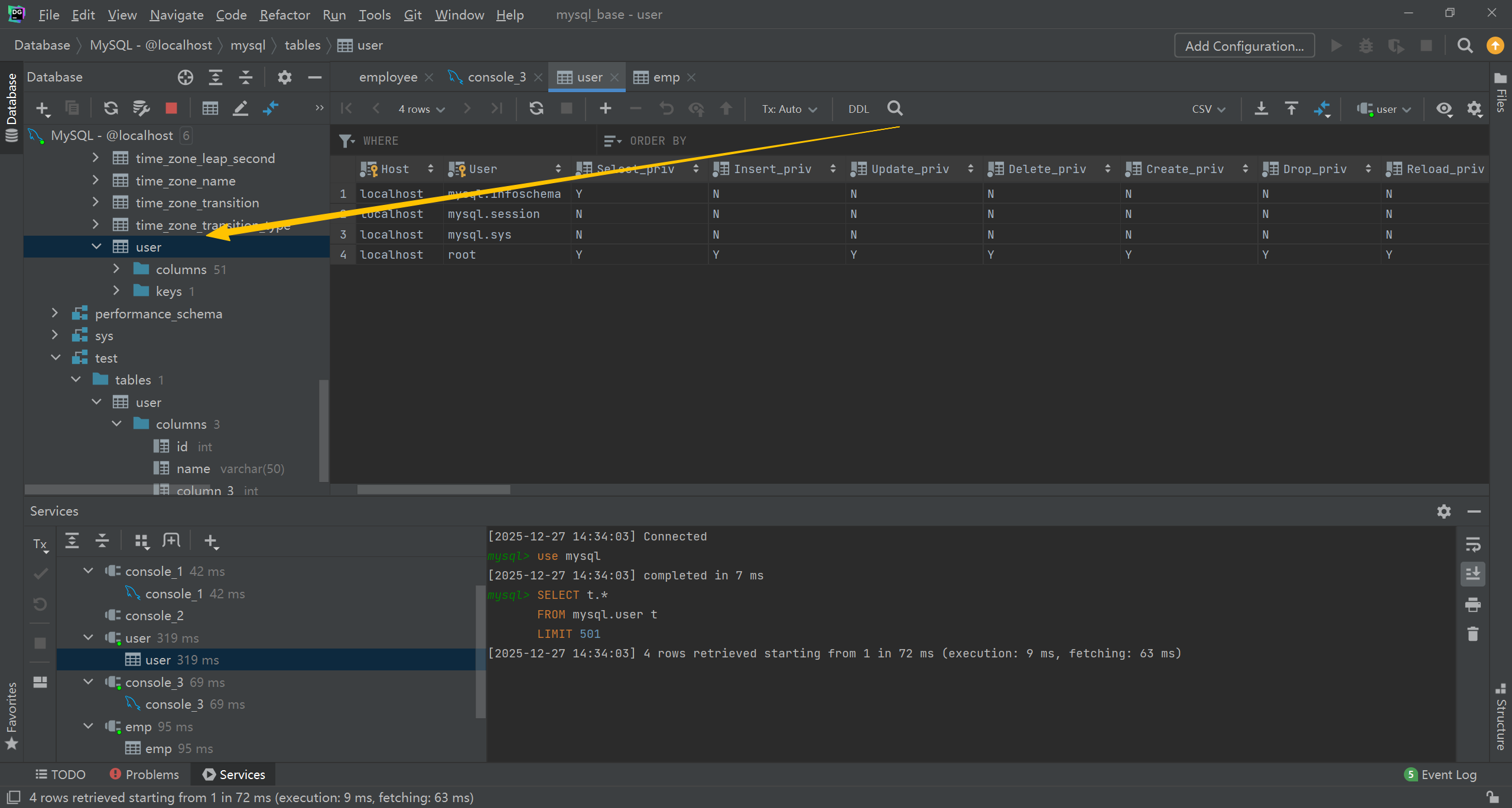 通过sql创建用户会发现是没有任何权限的,可以访问MySQL但是没有访问其他数据库的权限