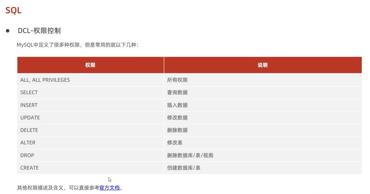 | DCL | Data Control Language | 数据访问控制 | GRANT、REVOKE |