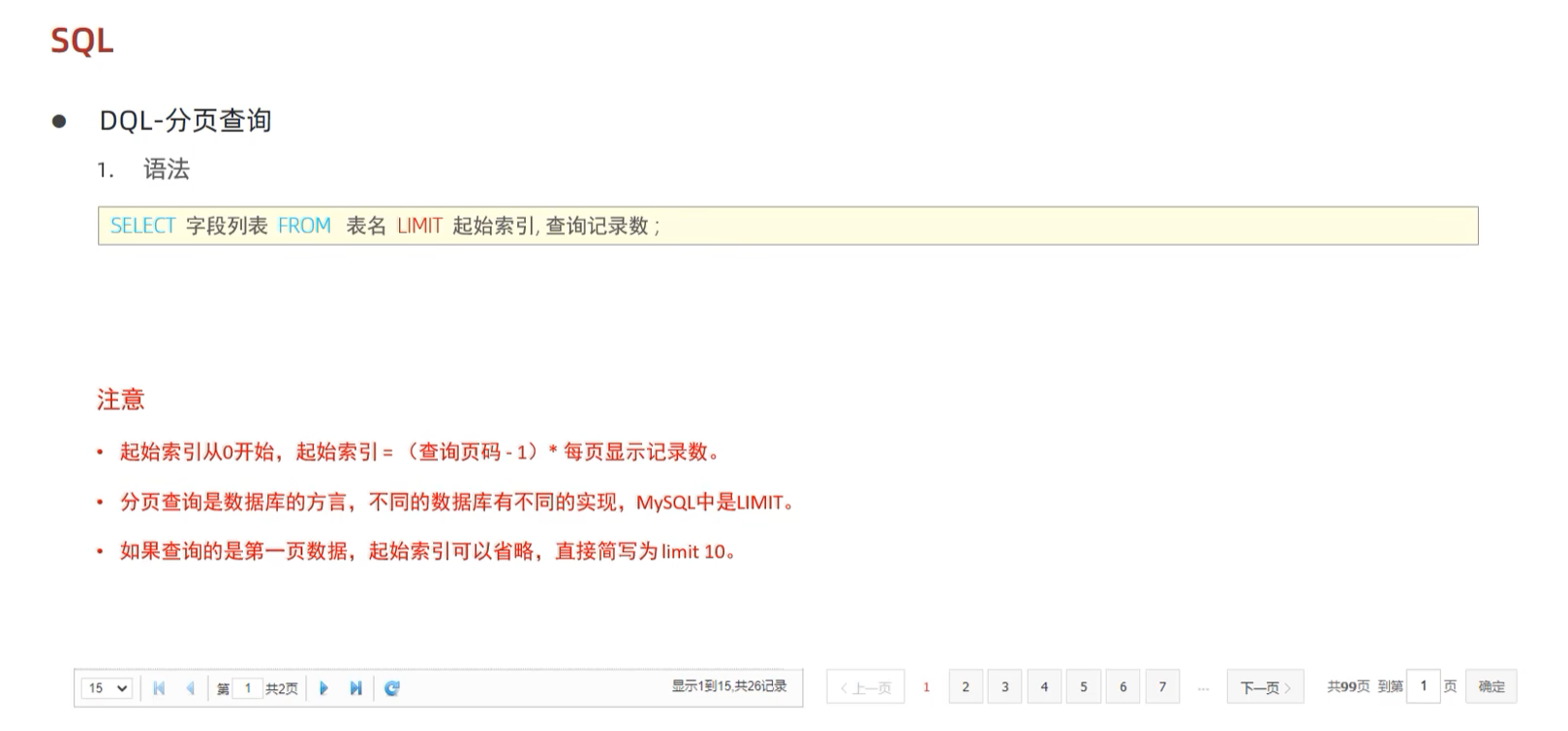 -- 起始索引 =( 页码-1)* 展示x记录数