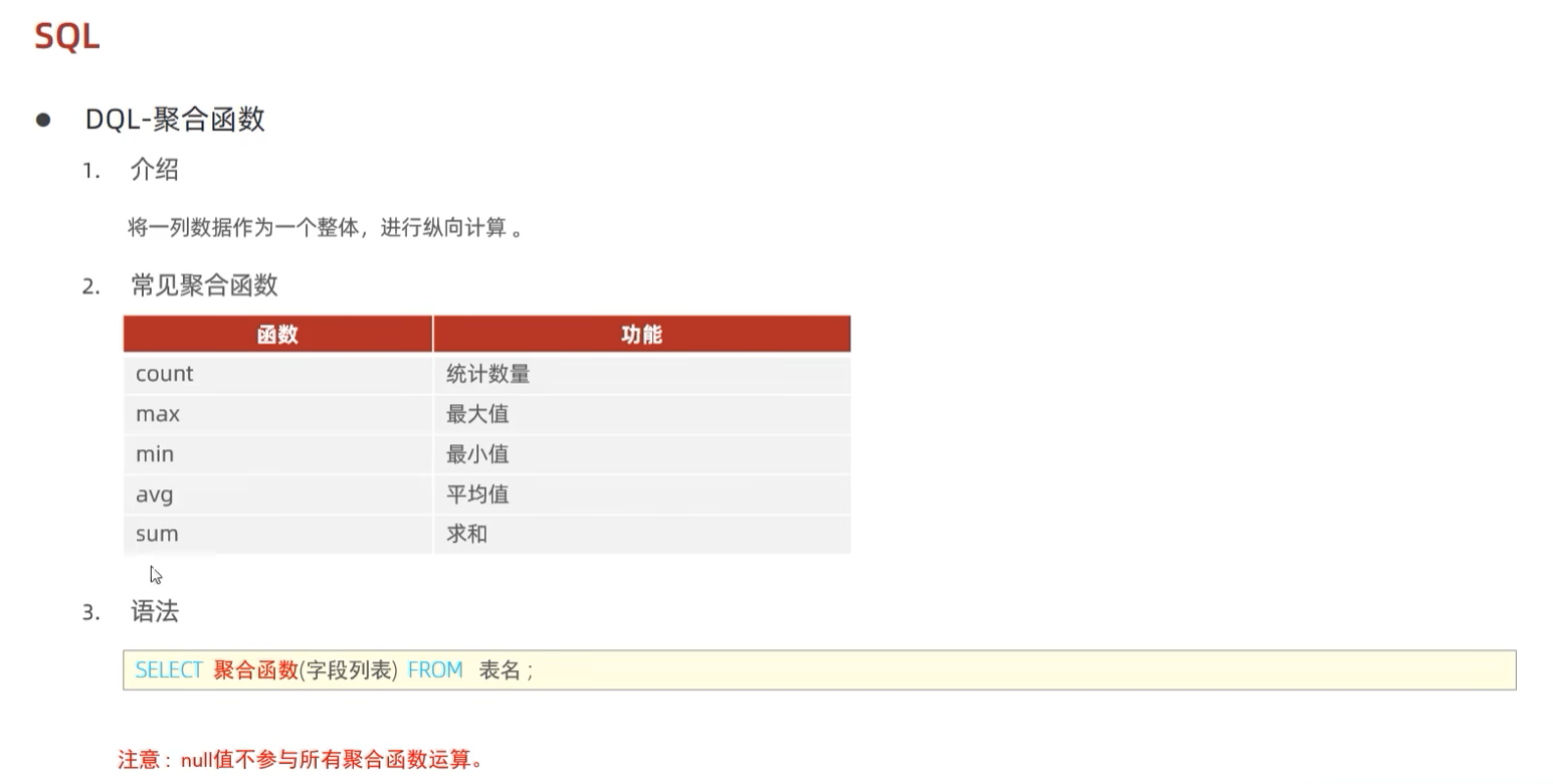 聚合函数是DQL的"宝藏",它能将多行数据转换为有意义的统计信息。