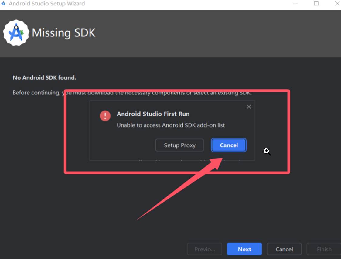 3)先【Cancel】,暂缓安装SDK,点【Next】