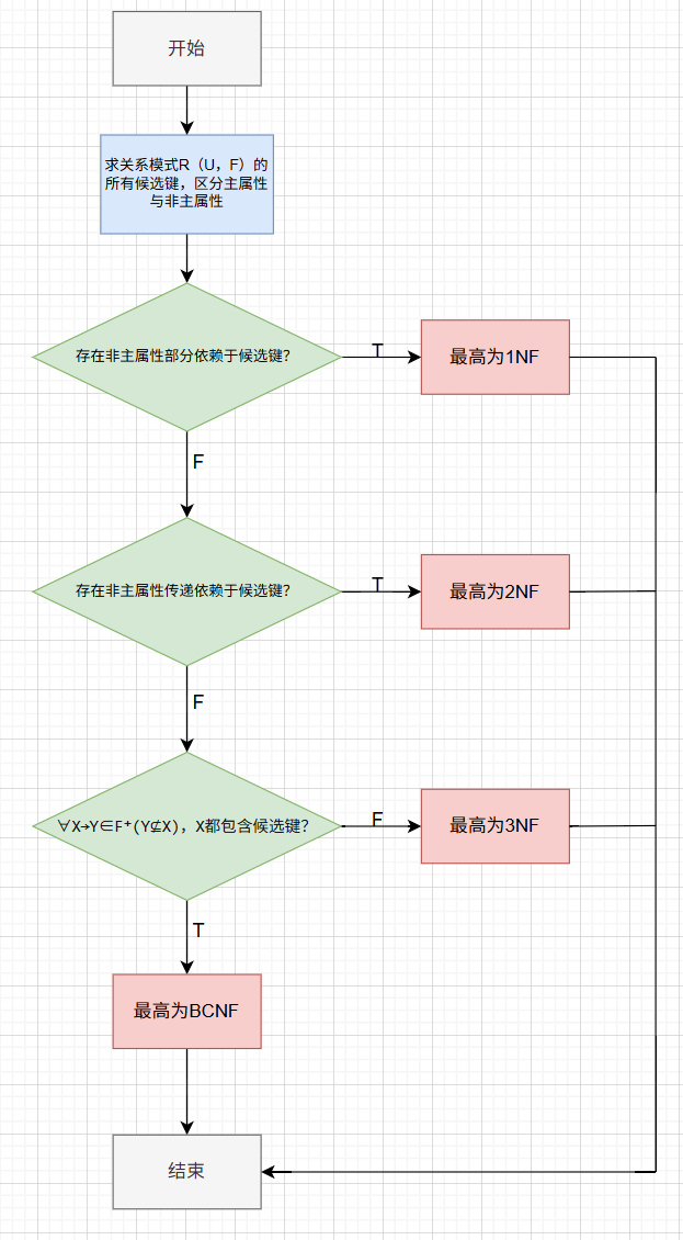 注:流程图中判断BC范式时,理论上应该检查F⁺,但实践中通常只检查F。
