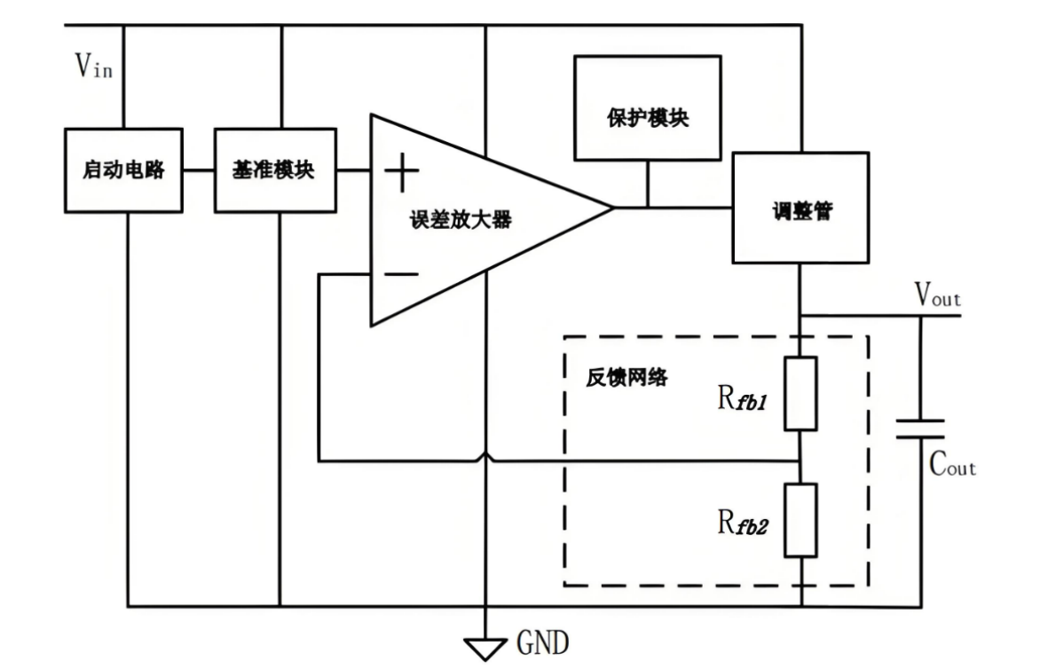 LDO通过调节内部功率晶体管的导通状态,使得输出电压能够稳定在设定值。当输⼊电压⾼于输出电压时,LDO将控制功率晶体管的导