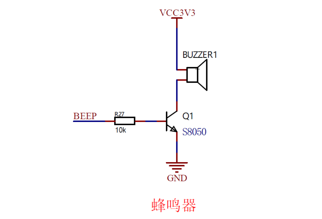 蜂鸣器驱动电路⼀般都包含以下⼏个部分:⼀个三极管、⼀个蜂鸣器、限流电阻。