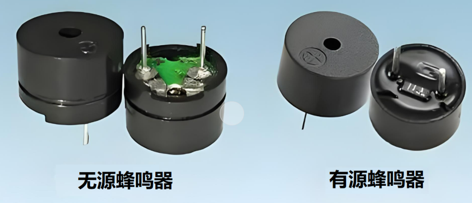 如果引脚都朝上放置时,有绿⾊电路板的⼀种是⽆源蜂鸣器,⽤⿊㬵封闭的⼀种是有源蜂鸣器。