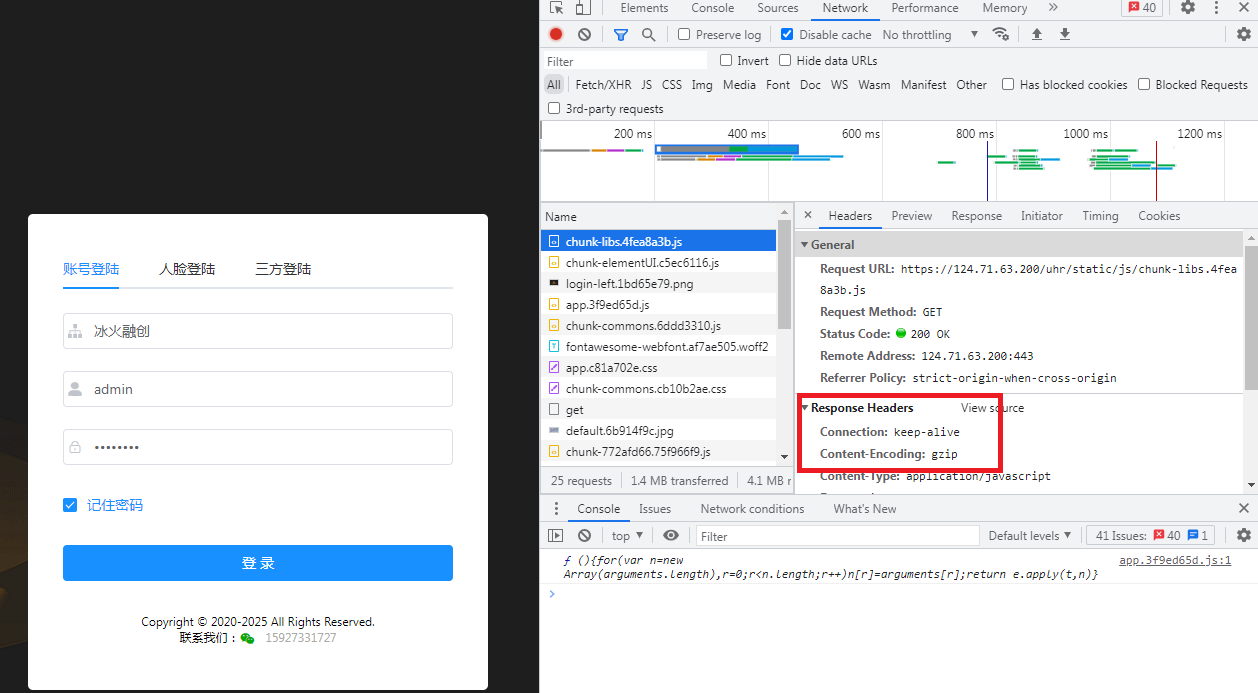查看其中一个请求的响应头 Content-Encoding: gzip , 请求的是gzip文件,内容已压缩。