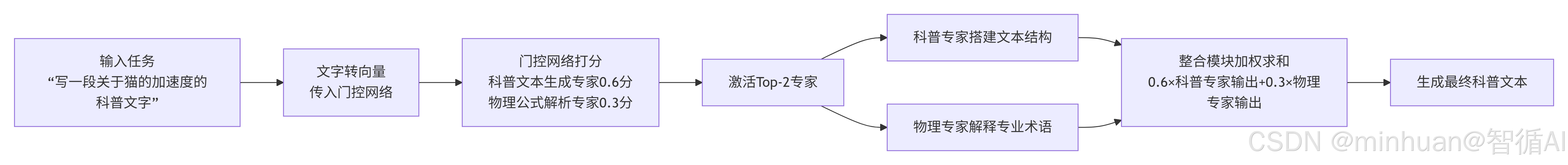 结合具体任务,比如"写一段关于猫的加速度的科普文字",我们拆解MoE的完整执行流程,配合流程图看,一目了然: