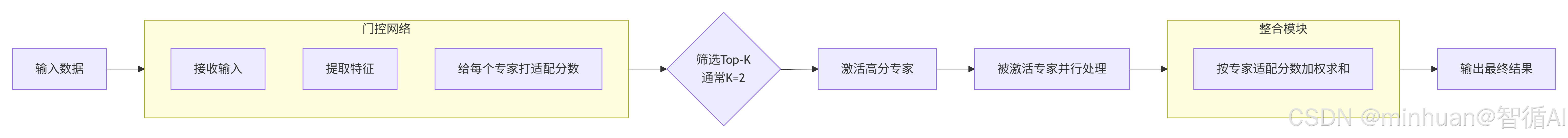 总结来说:输入数据先进入"门控网络"审题打分,门控网络给每个专家打"适配分数",然后选分数最高的2个专家(图中K=2)激活;被选中的专家并行处理任务,最后通过"整合模块"加权求和,输出最终结果,未被选中的专家全程休眠,不消耗资源。