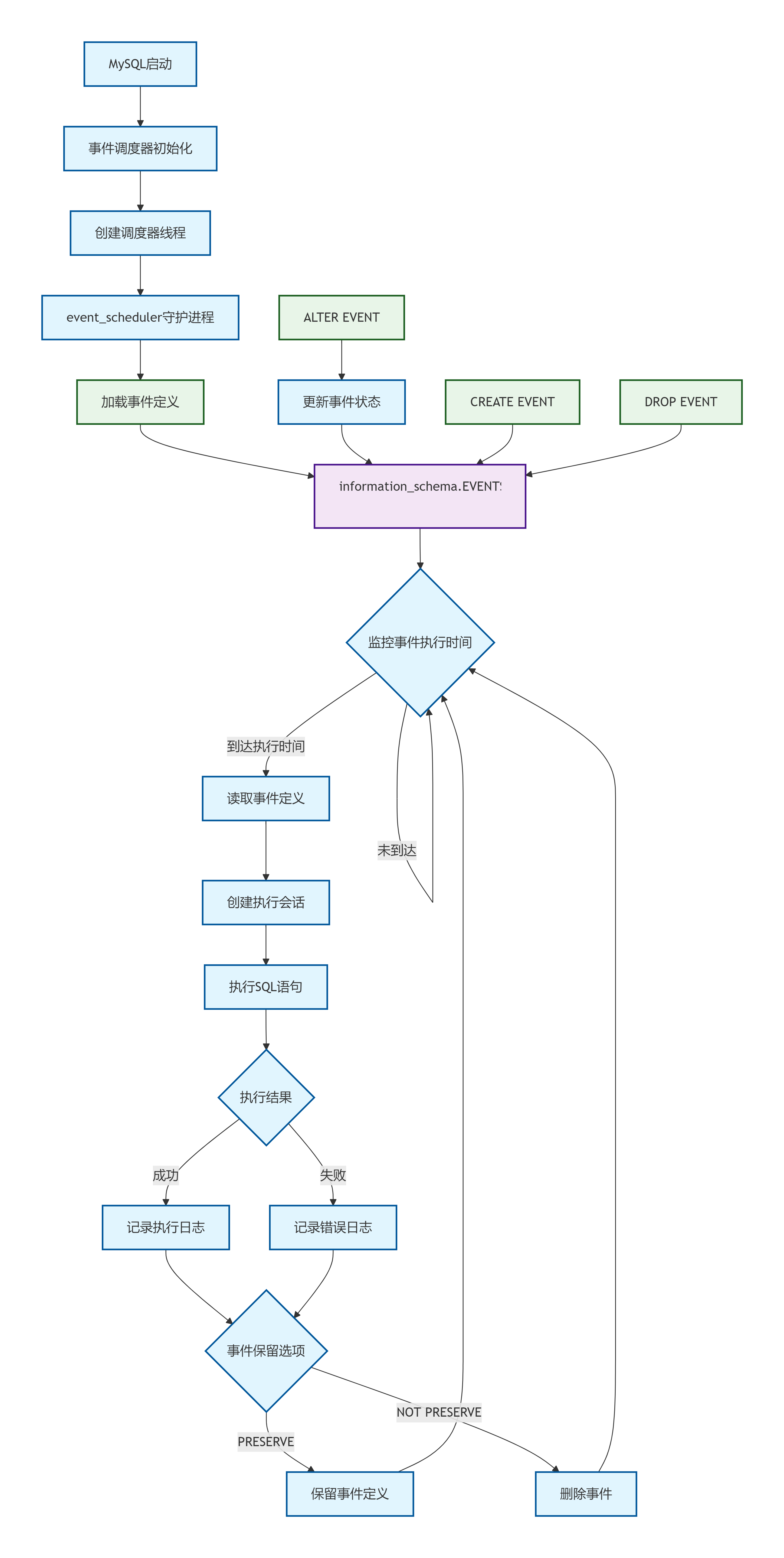 事件存储 :所有事件的定义被存储在information_schema.EVENTS系统表中,这个表包含了事件名称、调度计划、执行语句、状态等所有元数据。