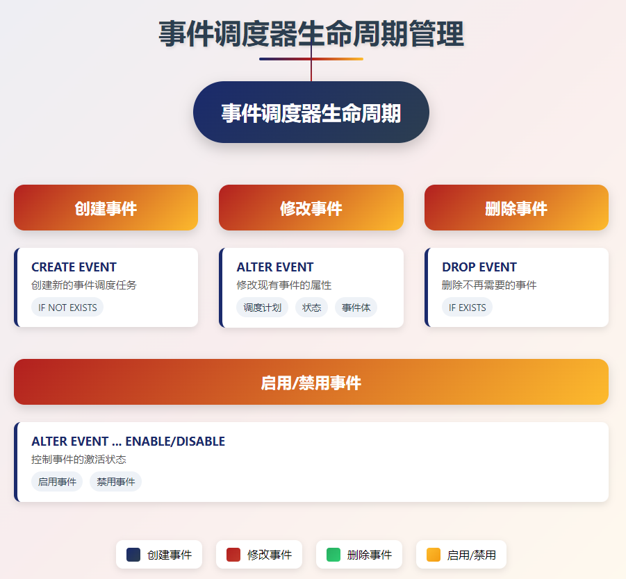 事件状态管理:每个事件都有一个状态(ENABLED/DISABLED),可以动态控制其执行。同时,事件执行完成后,可以选择保留定义(PRESERVE)或自动删除(默认)。