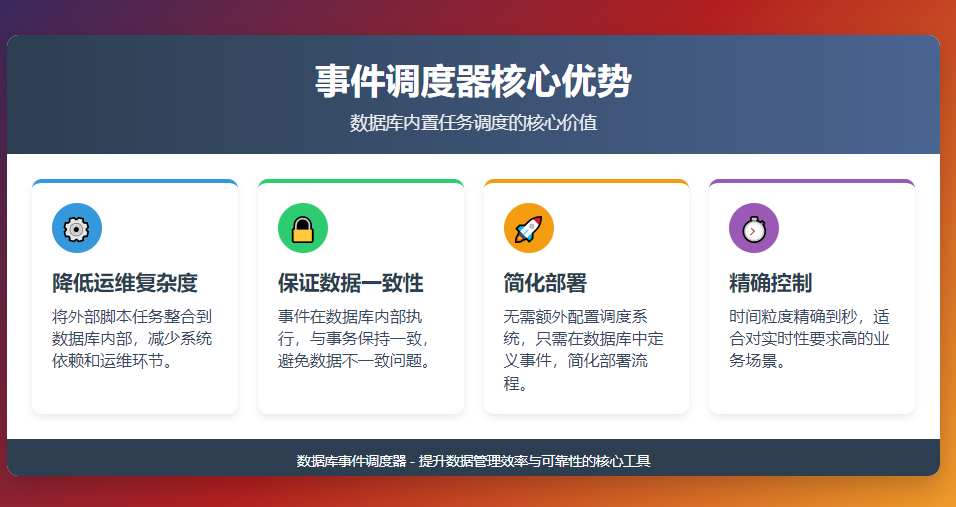 简化部署:无需额外配置调度系统,只需在数据库中定义事件