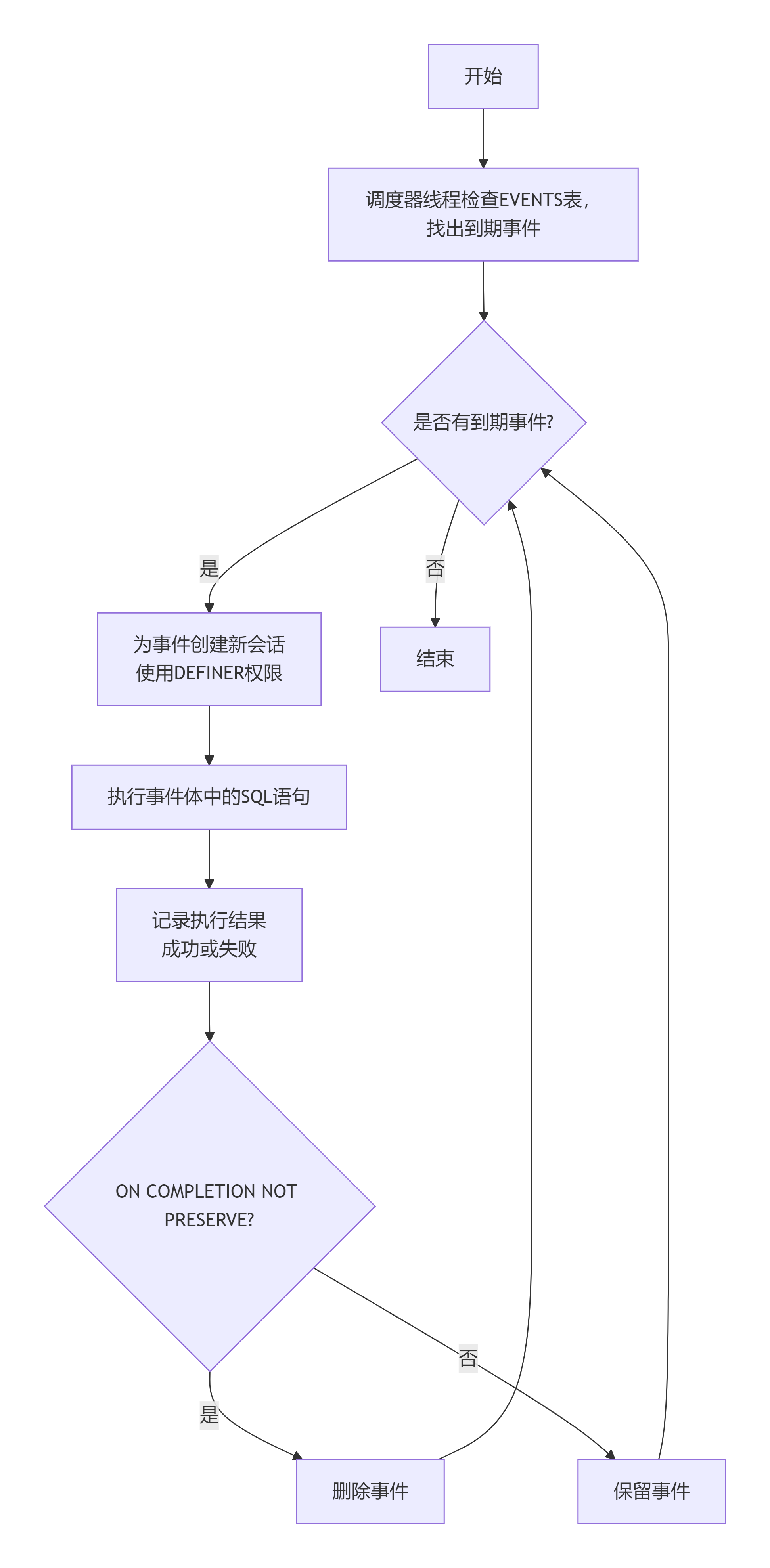 事件执行引擎 :当到达预定时间点时,调度器线程会从EVENTS表中读取待执行的事件,然后在当前会话中执行事件体中的SQL语句。