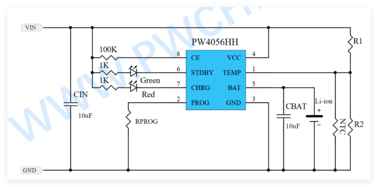 对于PW4054H/57H/56HH,充电电流 ICHG ≈ 1000 / RPROG。例如,设置500mA充电电流:RPROG = 1000 / 0.5A = 2kΩ。应选用1%精度的电阻。