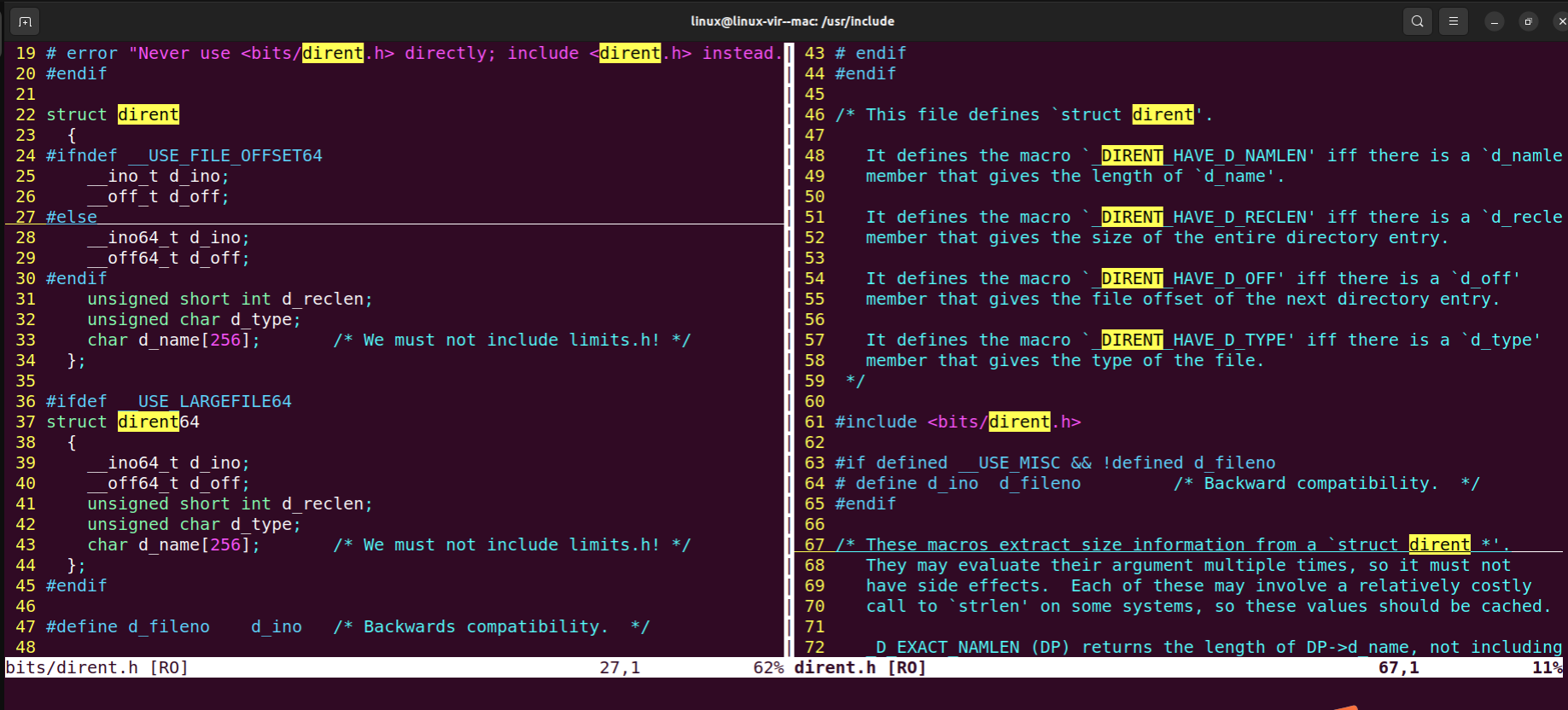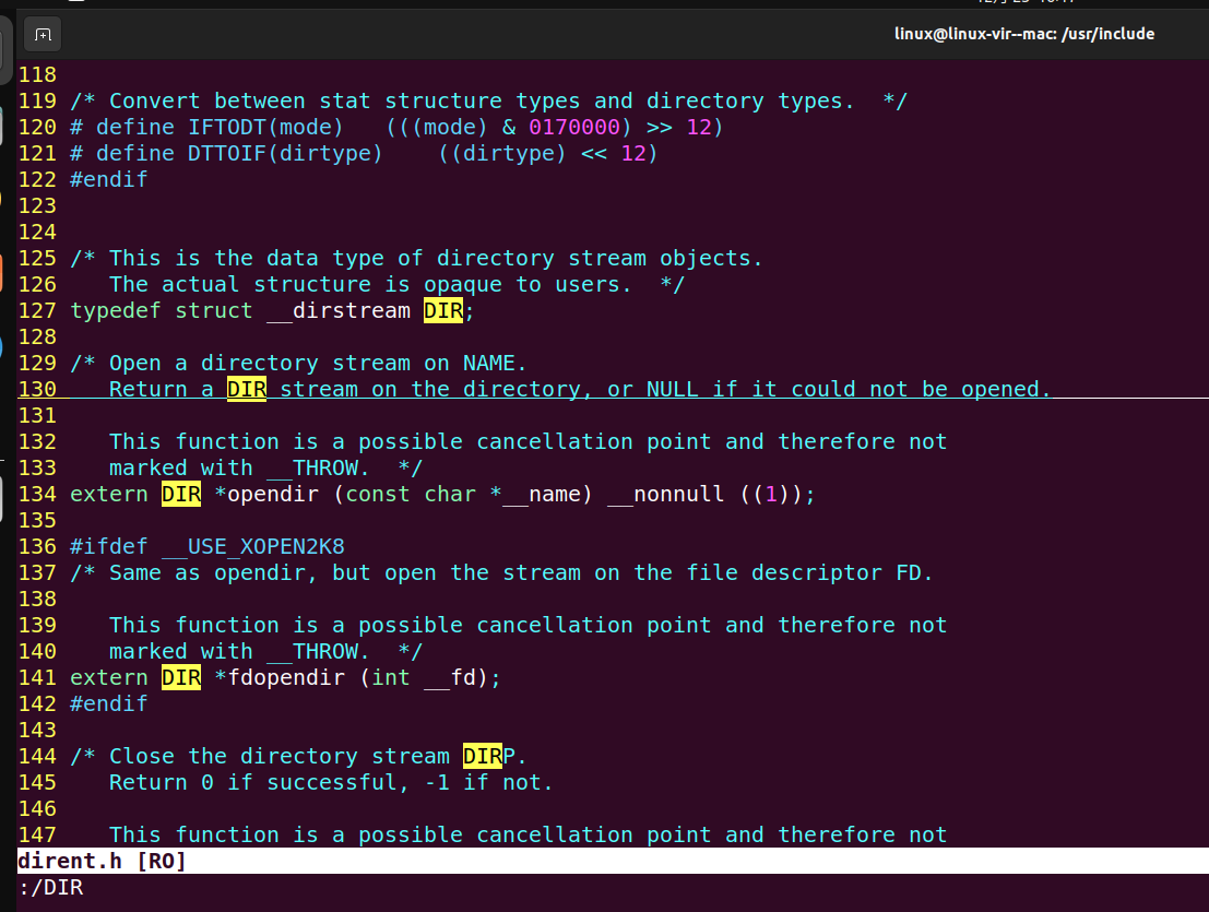 vim /usr/include/dirent.h- 在C语言的标准库中,DIR 类型被用于表示一个目录流。它通常定义在 <dirent.h> 头文件中,并用于目录的遍历操作。DIR 类型可能是一个不完整类型(incomplete type),这意味着它的具体实现细节在<dirent.h> 头文件中并没有完全展开,而只是声明了它的存在,这样的设计允许库的实现者在不暴露内部数据结构的情况下提供接口