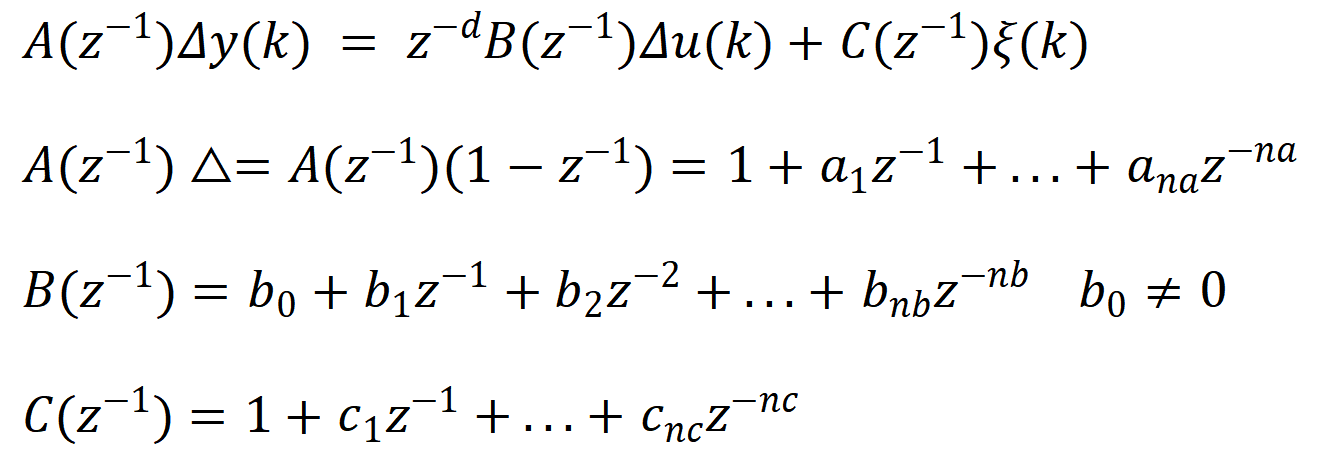 其中是方差为0.01的白噪声,上文的实例相同,只不过C(z)不等于1了,写成适合GPC控制的模型如下: