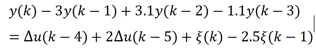 y(k) = -A(2:na+1)*[y(k-1);y(k-2);y(k-3)]+B*[dU(k-4) dU(k-5)]'+C*[u_noise(k) u_noise(k-1)]';
