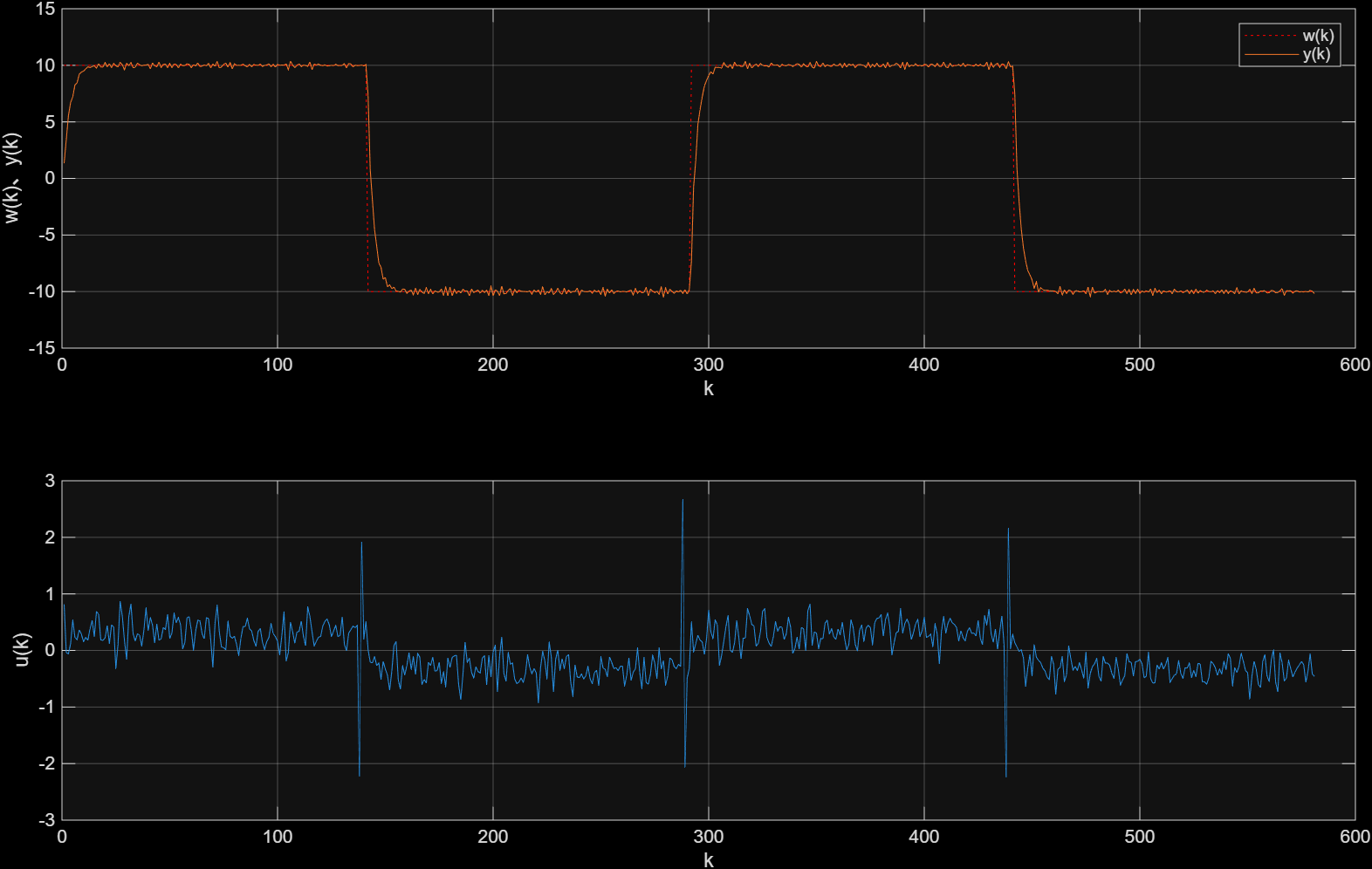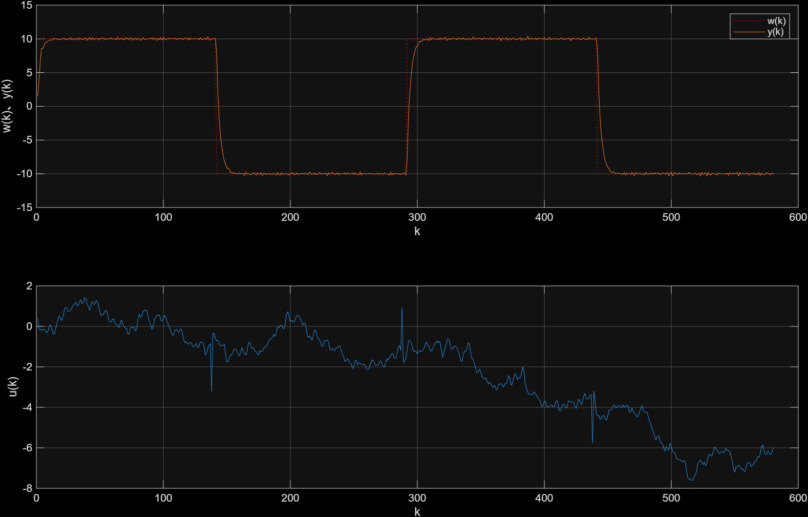 可以看出,控制效果非常好。在幅值为10的方波期望信号、方差为0.1的高斯噪声分布下,还是第一次理论上有这么好的跟踪效果