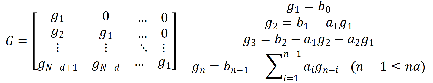 ym(k+j) = -A(2:na+1)*flip(ym(k+j-na:k+j-1))'+B*flip(dU(k+j-d-nb:k+j-d))'+C*flip(u_noise(k+j-nc:k+j))';