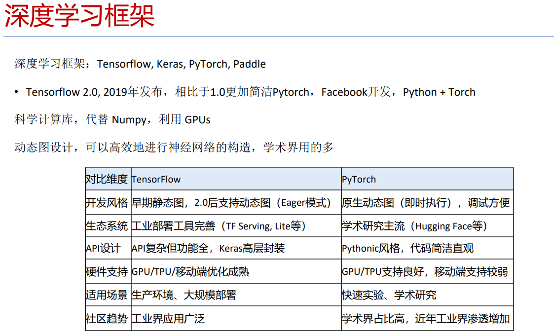 | 生态系统 | 工业部署工具完善(TF Serving, Lite, JS等) | 学术研究主流(Hugging Face等),工业渗透增加 |