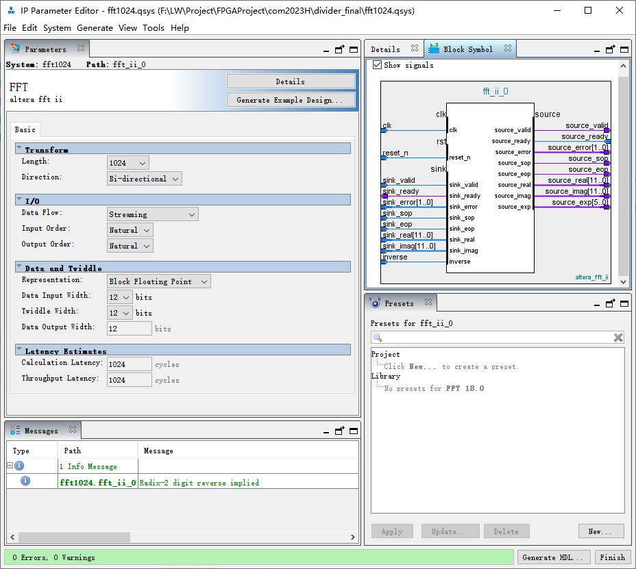 Data Input Width(数据输入宽度)这个应该大家也都明白,代表着输入数据的位宽,位宽越宽,数据的精度就越高。Twiddle Width(旋转因子宽度)这个旋转因子就是我在上文手写的理论计算方法里的旋转因子,是一个模长等于1的复数,因此位宽越宽也同样代表了其值的精度。