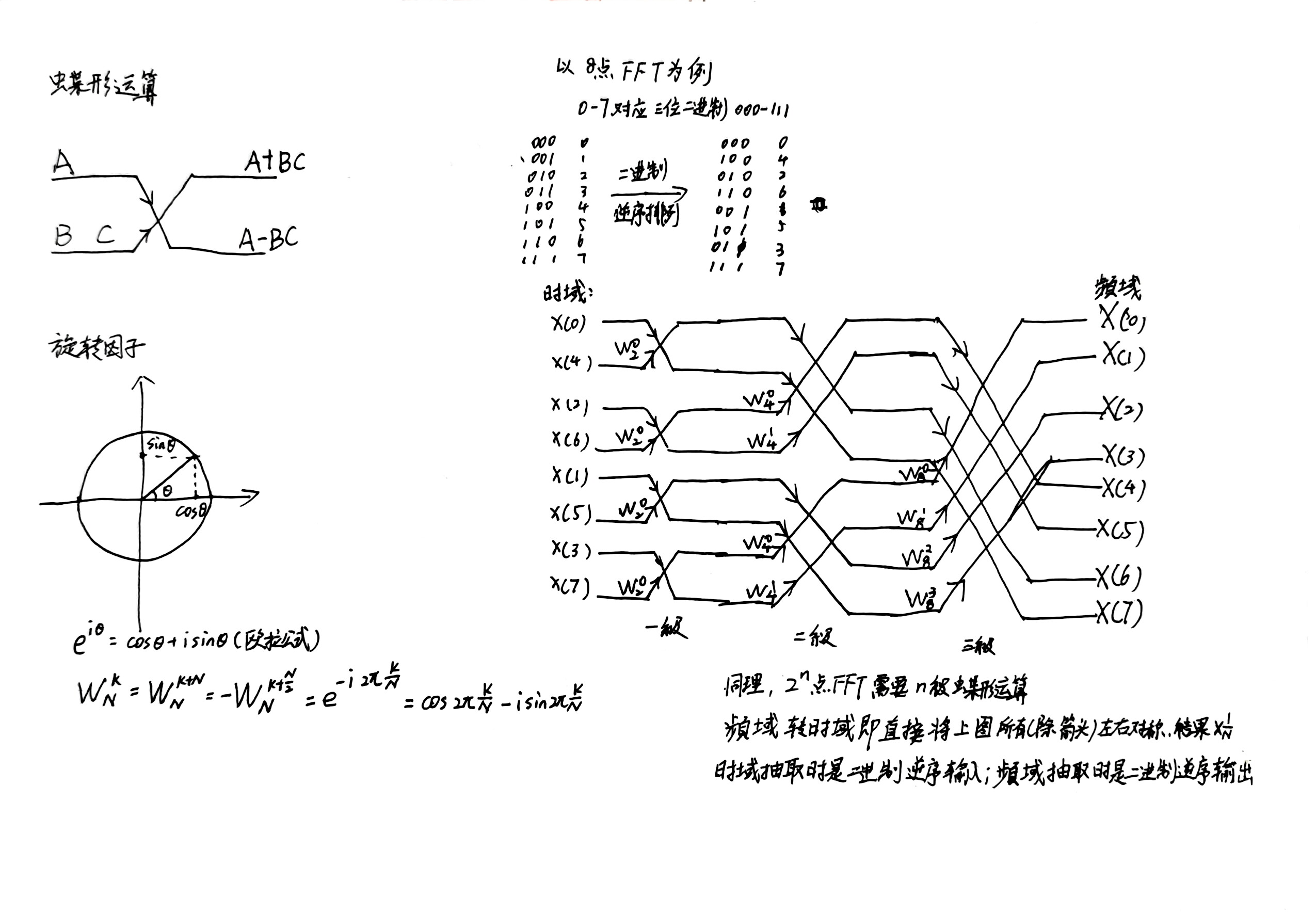 我在数字信号处理的课程上以知识点总结的名义讲过FFT的运算,具体的原理方面的讲得一定没有专业的老师好,但是最后的目的还是会计算方法、要算对(国内要求)。FFT的核心是蝶形运算和旋转因子,都在下面我自己写的纸上。这里我是用基2的8点FFT进行的距离,16点甚至更高的点数就不向下延伸了,注意事项就是时域抽取和频域抽取的关系是在单向运算(单向正变换或单向反变换)中的两种不同的运算方法。重点关注一下二进制逆序排列的操作,时域抽取、频域抽取上哪里需要进行二进制的逆序排列等。