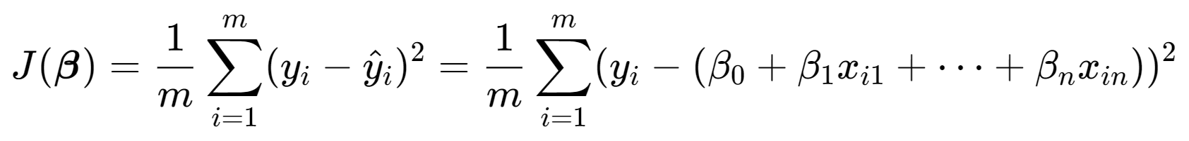 J(\\boldsymbol{\\beta}) = \\frac{1}{m} \\sum_{i=1}\^{m} (y_i - \\hat{y}*i)\^2 = \\frac{1}{m} \\sum*{i=1}\^{m} (y_i - (\\beta_0 + \\beta_1 x_{i1} + \\dots + \\beta_n x_{in}))\^2