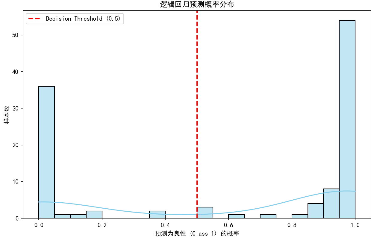 plt.xlabel("预测为良性 (Class 1) 的概率")