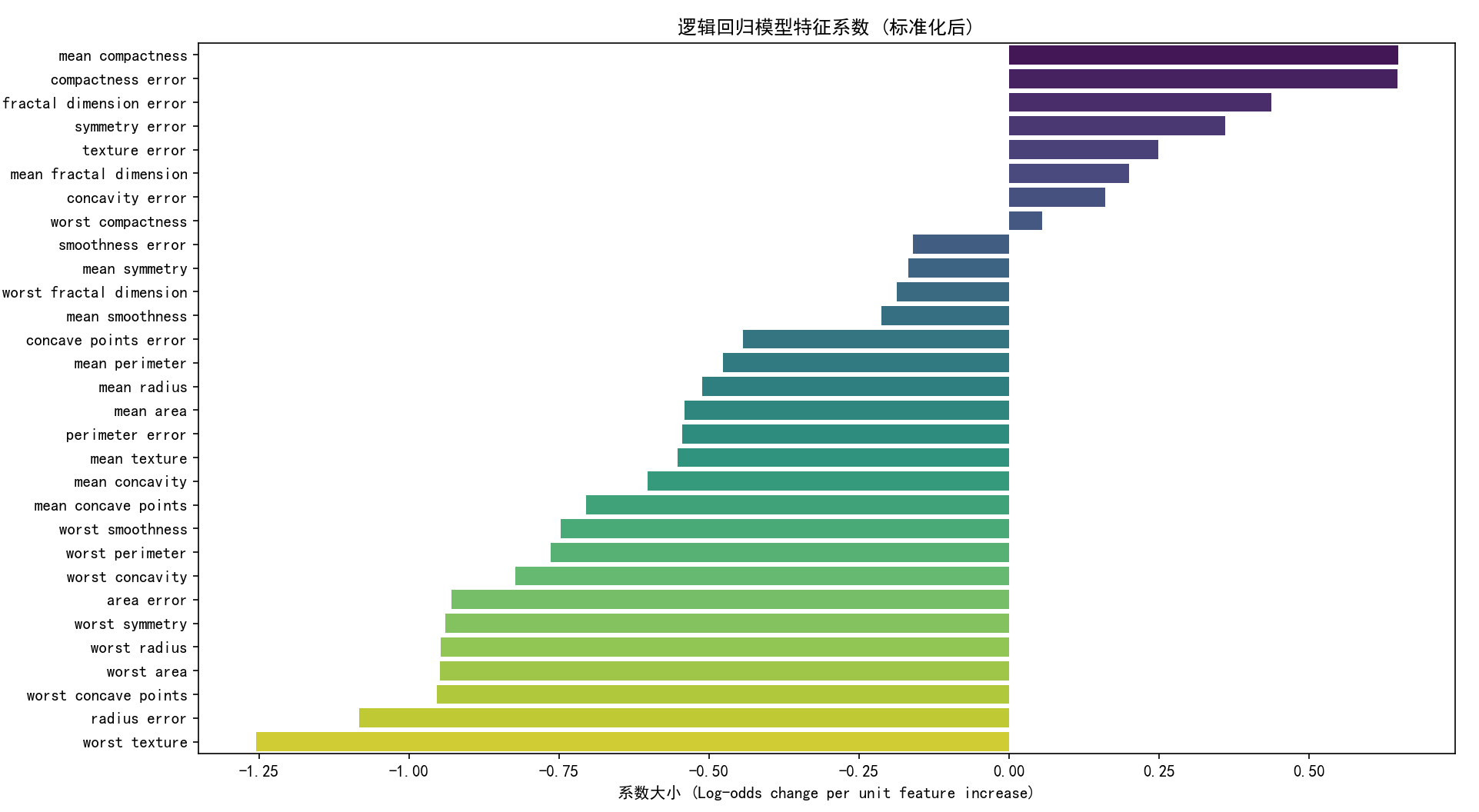 accuracy_score计算准确率,confusion_matrix绘制混淆矩阵,以及classification_report提供更详细的精确率、召回率和 F1 分数。 - 参数解读: 分析模型的截距项和标准化后的特征系数,理解它们对 log-odds 和最终概率的影响。