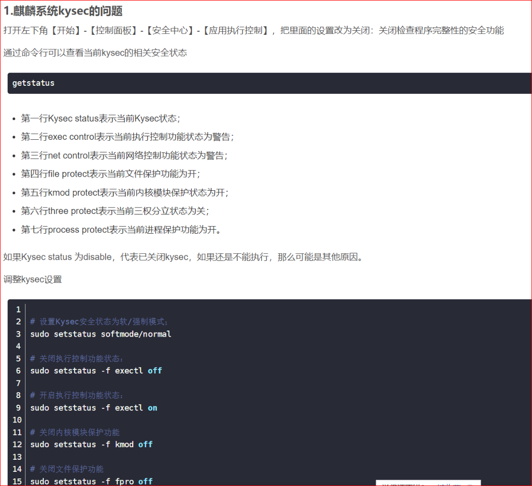 关闭检查程序完整性的安全功能,通过命令行可以查看当前kysec的相关安全状态