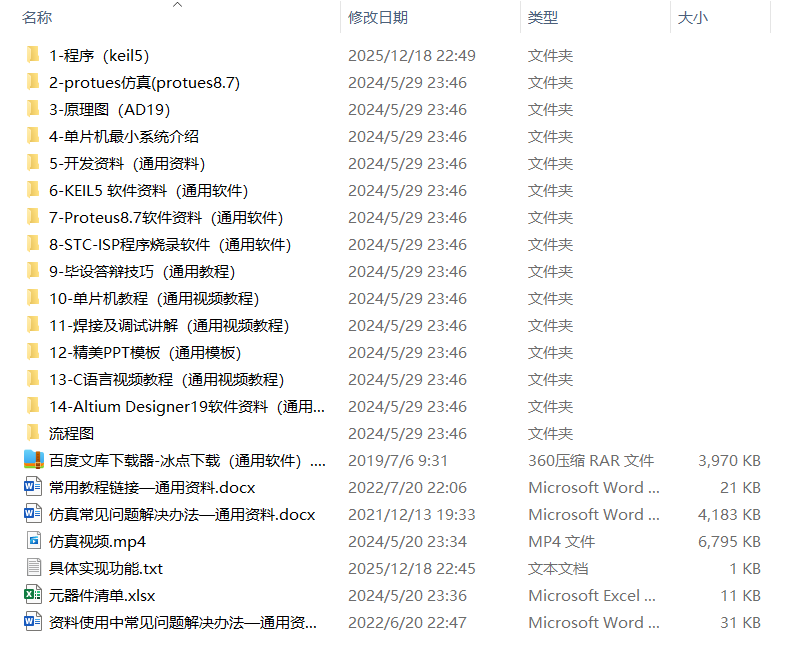 全部资料包括程序(keil5)、protues仿真(protues8.7)、设计说明、答辩PPT、开发资料、资料使用介绍、仿真视频、最小系统介绍视频等。