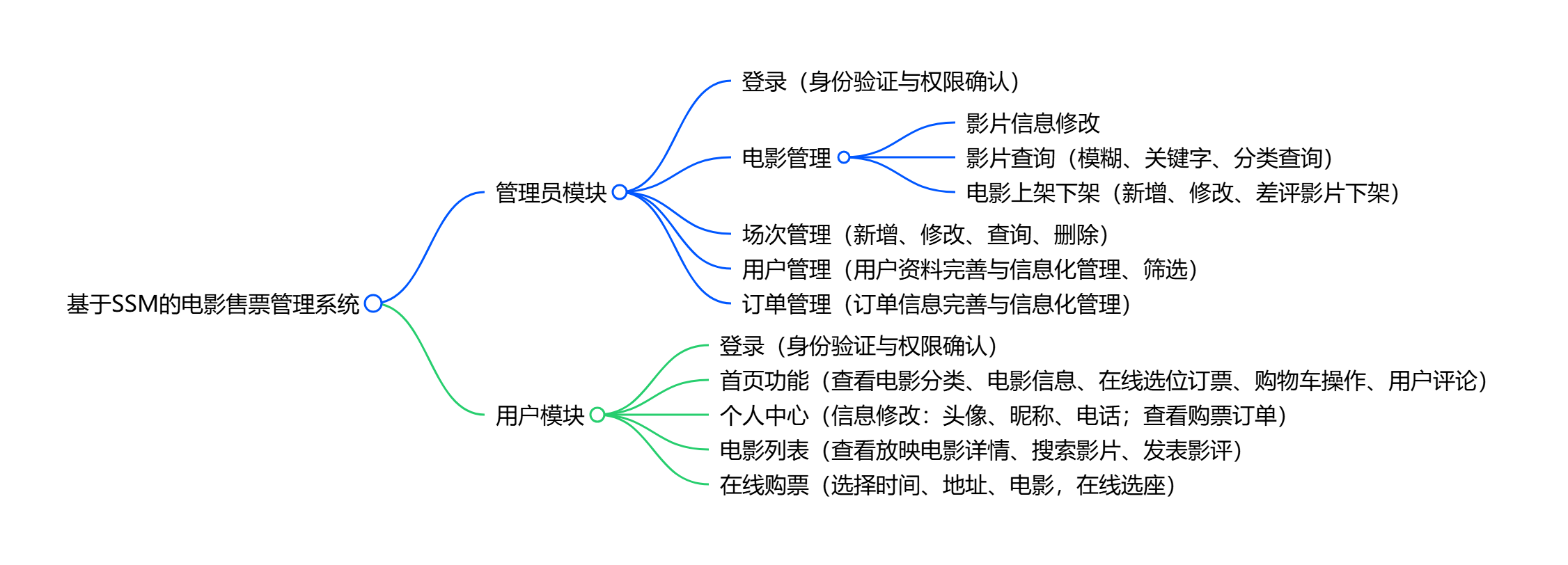 系统主要分为管理员和用户两大角色:管理员可进行电影信息管理、场次排片、订单处理和用户管理;用户可浏览电影、在线选座购票、查看订单及个人中心。