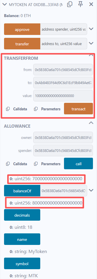 转账后,授权额度减少,发送者账户余额减少,接收者账户余额增加