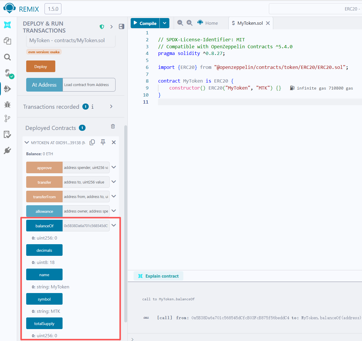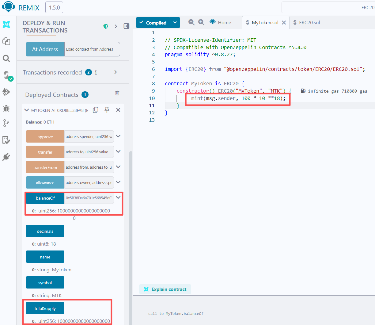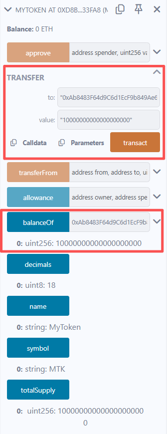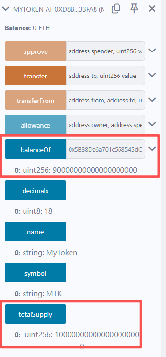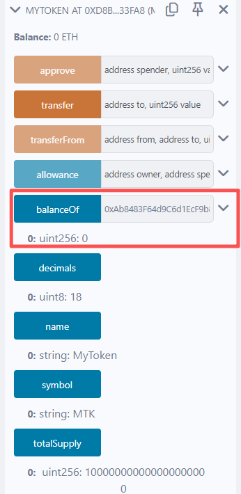 合约中设置了代币名称为MyToken,代币符号为MTK。没有设置totalSupply,没有转账,部署账号扽balance是0