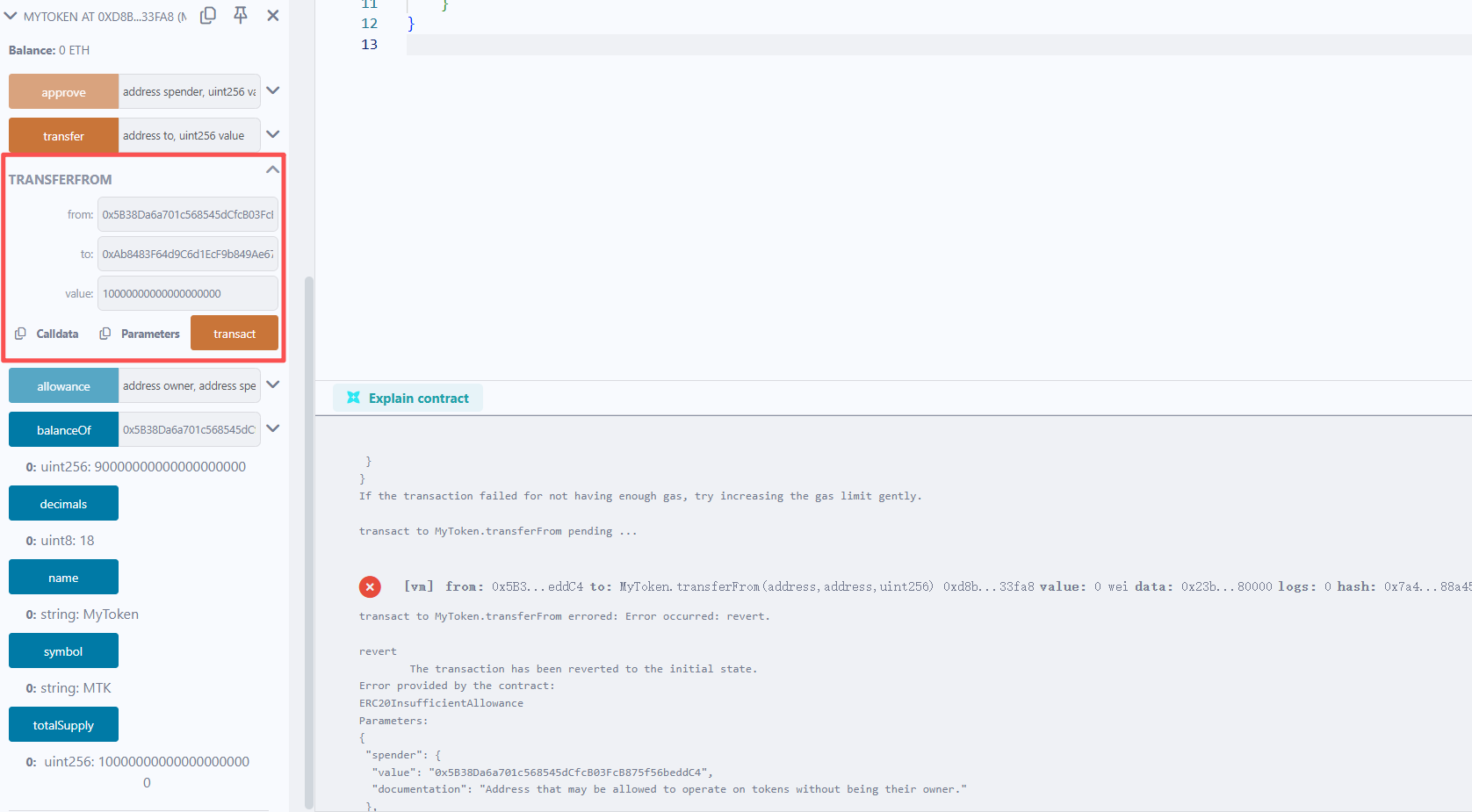 合约创建者账户调用合约的transFrom接口,合约创建者账户给其他账户转账,提示失败。需要先授权。即使调用者账户本身给其他账户转账,也需要先给自己账户授权。