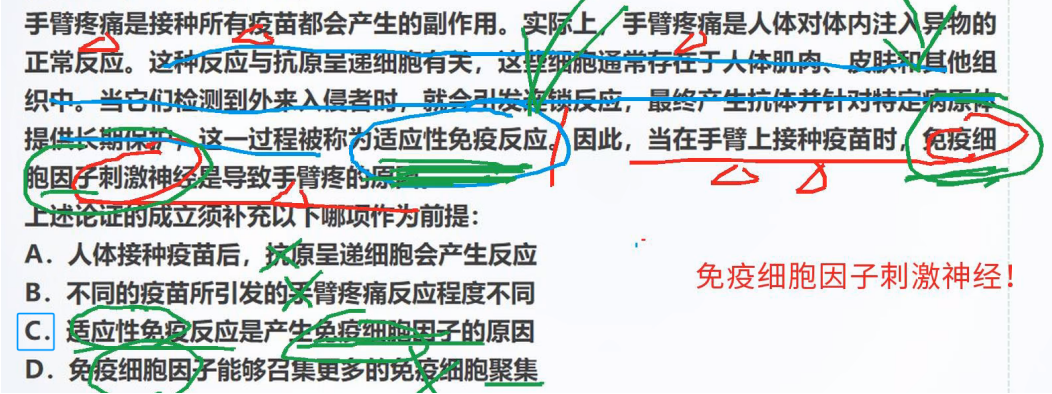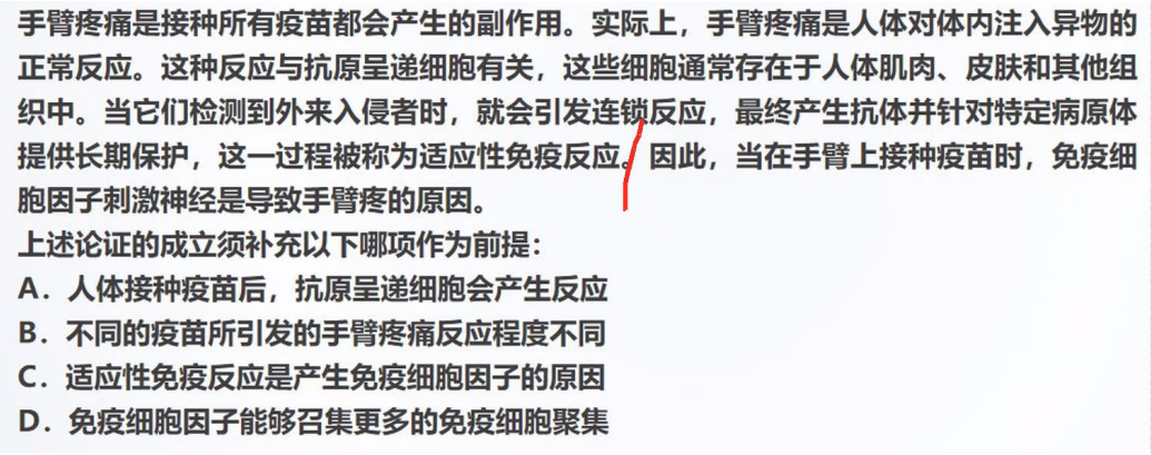 适应性免疫反应->免疫细胞因子刺激神经->手臂疼