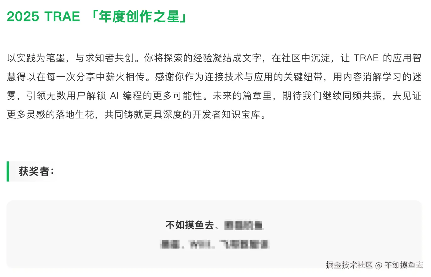 12 月 27 号,获得了 TRAE 2025 年度五大用户奖------年度创作之星,感谢 TRAE。
