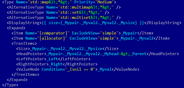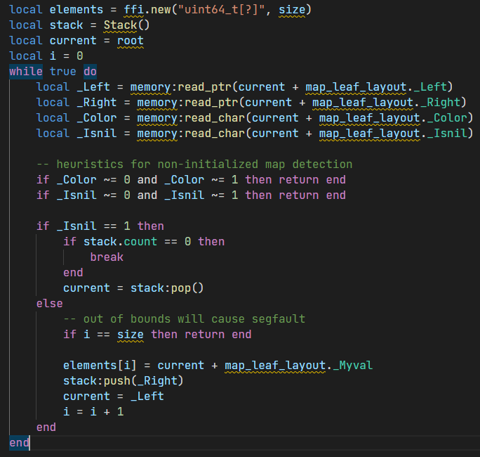 这里的区别在于我们增加了相当多的额外检查。与调试器提供的集合内容"粗略"视图不同,我们需要精确地确定分配及其内部集合是否有效。因此,对于 map 类型,我们会检查所有字段的值,包括调试器认为"无关紧要"的字段。这也是我们选择脚本式方法而非像 NatVis 那样的声明式方法的原因之一。
