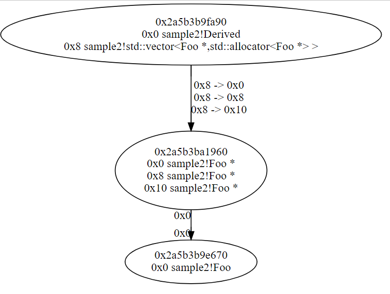 我们还可以构建分配之间的关系图。例如,如果我们需要了解如何访问位于地址 0x2a5b3b9e670 的 Foo 对象,我们将得到相应的图(我们使用Graphviz来构建图):