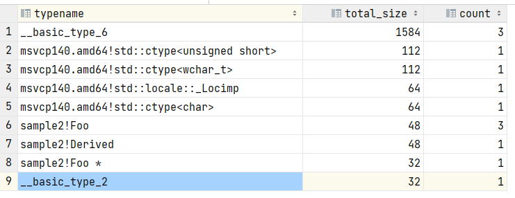 首先,除了预期的 Foo 和 Derived 结构之外,我们还看到了一些额外信息。这些是一些系统/服务结构,我们并不关心;在实际的转储文件中,它们只属于统计误差。