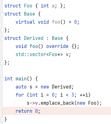 在 Derived 结构体内部分配一个包含指向 Foo 结构体的指针的 std::vector。这些结构体不包含虚函数。接下来,在堆上为 Derived 结构体分配空间,并将三个元素(指向 Foo 结构体的指针)放入 vector 中。