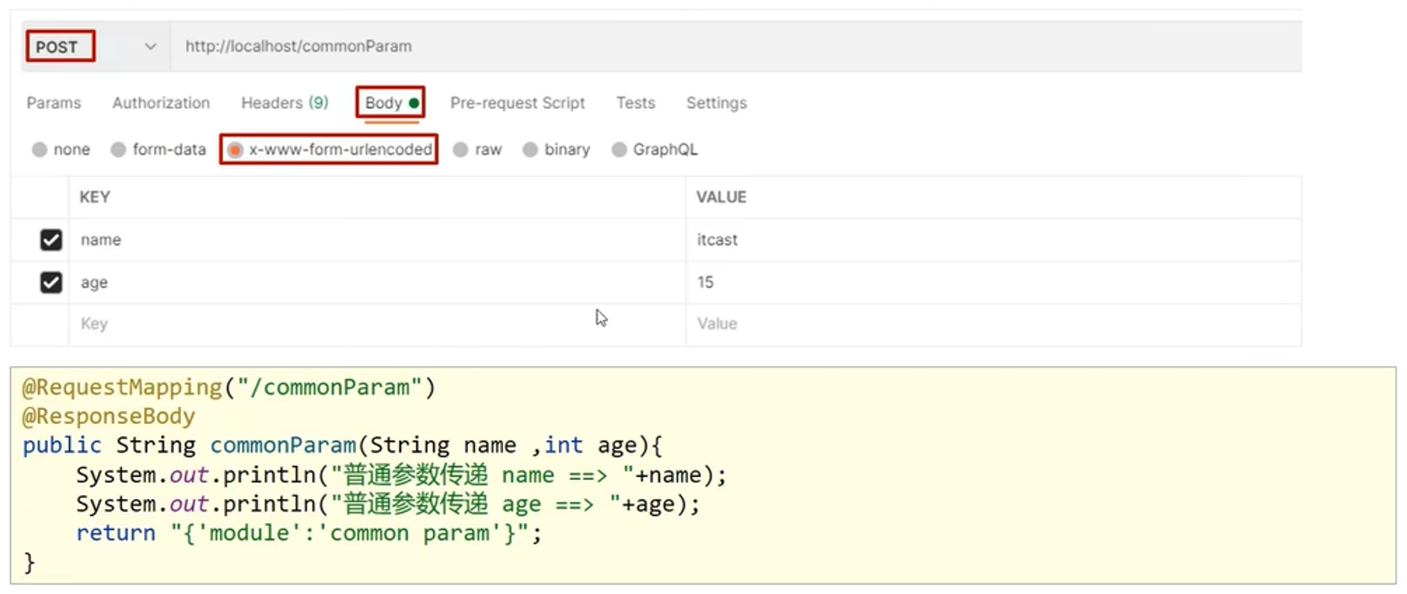 普通参数: form表单post请求传参,表单参数名与形参变量名相同,定义形参即可接收参数